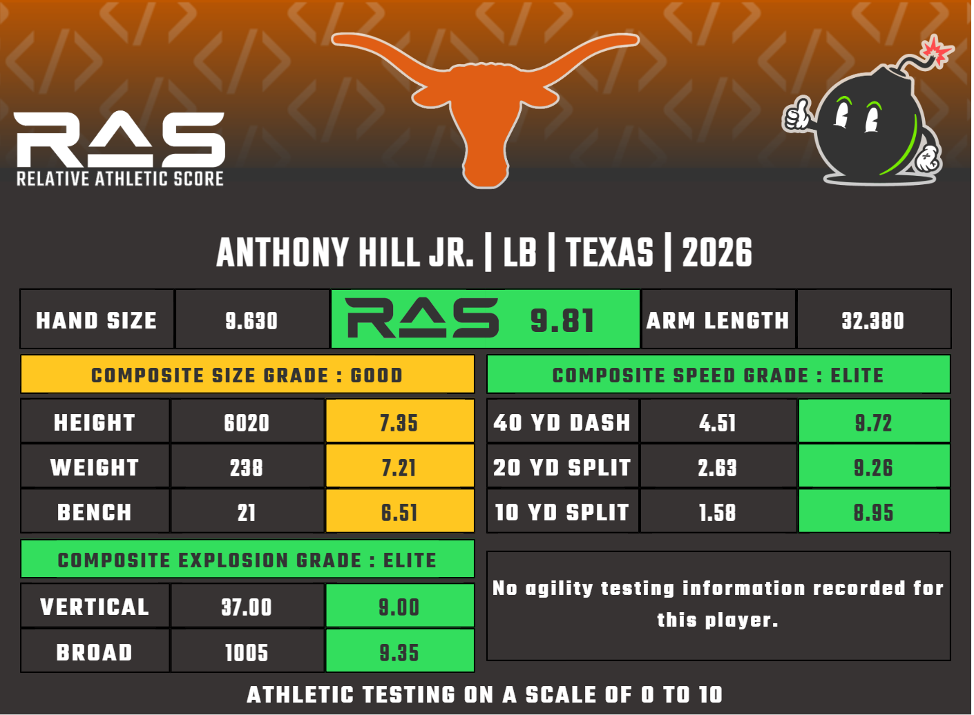 As a 20-year-old in the SEC, Hill had that radar chart above. Is it spectacular? No, but again, 20 in the SEC. His development curve is still in its infancy, and he exhibits the traits I love to see out of a linebacker, even if it comes with a slightly underdeveloped mental side of the game.