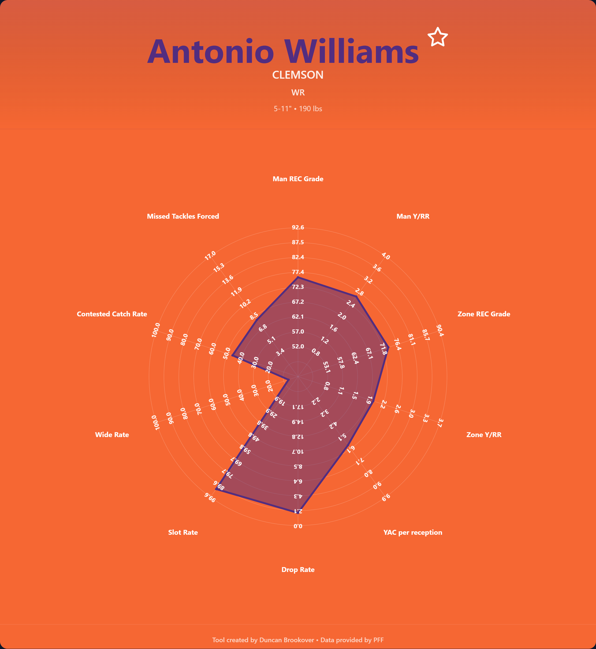 I am usually in agreement with PFF with their grading system, but Antonio Williams' zone grade is just not correct. The standout part of Williams' game is his ability to find spots in zones. He's exceptionally skilled at finding the precise spot to position himself, making it simple for his quarterback to locate him. He doesnt stop once he is in position though; he continues to work to make himself stay in the best position possible. Williams has some of the best zone feel of any WR in this class.