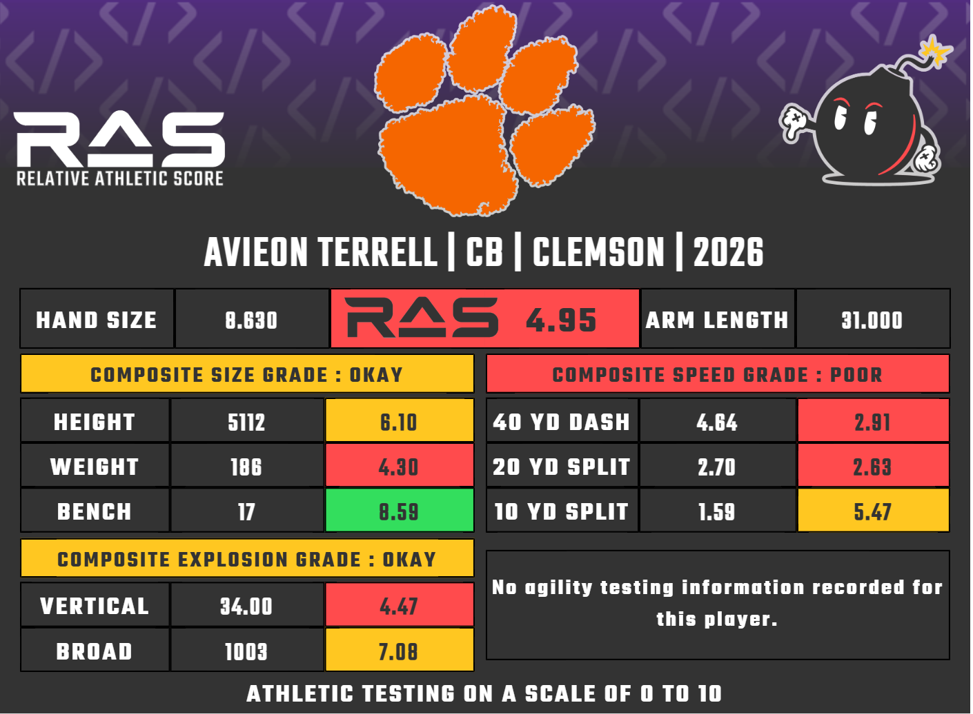 Terrell played mostly outside CB during Clemson's ill-fated 2025 season. He was tasked with keeping up with the toughest matchups most of the time, while not being a strict travel corner. For a team that struggled as much as it did, Terrell had to do a lot to hold down the passing defense, and performed admirably.