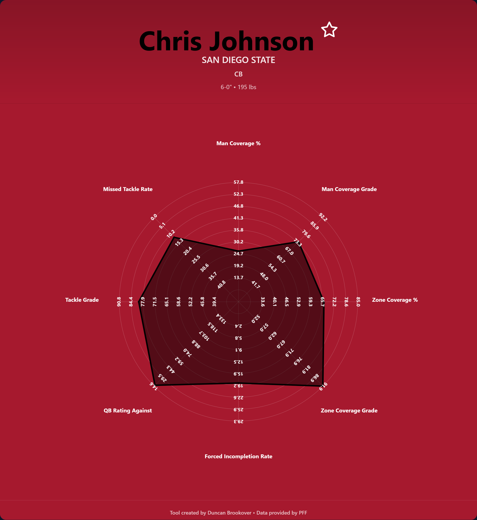 Chris Johnson grew up in Corona, California, and attended Eleanor Roosevelt High School, where he was an elite defensive player who also blocked three kicks on special teams. A three-star recruit ranked the 154th player in California and the 136th cornerback nationally, he committed to San Diego State and played his entire four-year career with the Aztecs. He redshirted in 2022, earned a reserve role with 31 tackles as a redshirt freshman in 2023, then emerged in 2024 with 38 tackles and his first career interceptions, earning All-Mountain West Honorable Mention. He returned for his senior year and it paid off: Mountain West Co-Defensive Player of the Year, AP Second-Team All-American, and Jim Thorpe Award semifinalist after posting 49 tackles, 4 interceptions, including a 97-yard pick-six in a 34-0 win over previously unbeaten California and a 40-yard return touchdown at Nevada, 9 pass breakups, 3 TFL, a sack, and a forced fumble. Quarterbacks who tested him in 2025 completed just 18 of 43 attempts for 185 yards, zero touchdowns, and 4 picks, a 16.1 passer rating allowed. He missed only 8 tackles in his entire college career for a 5.4 percent miss rate. Career totals: 152 tackles, 6 interceptions, a sack. He declared for the 2026 NFL Draft.