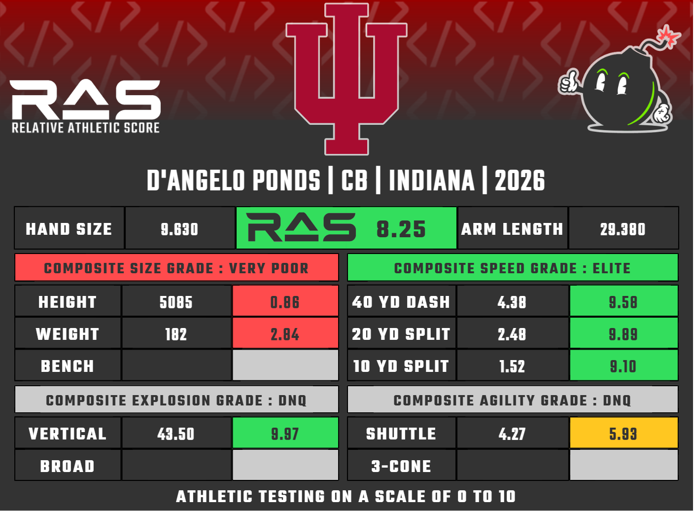 D'Angelo Ponds was born in Miami, Florida, and attended Chaminade-Madonna College Preparatory School in Hollywood, where he practiced daily against future Ohio State star Jeremiah Smith while winning state titles in the 100 and 200-meter dashes in track. He posted 77 tackles and 7 pass breakups on an undefeated championship team as a senior. Ponds, 5-9 and 170 pounds, ranked only as the No. 170 cornerback in the 2023 class. Syracuse was his only Power 4 offer. James Madison took the shot nobody else would. He started by mid-season as a true freshman, finishing 2023 with 51 tackles, 2 interceptions, and 13 pass breakups, and earning FWAA Freshman All-American and College Football Network Freshman Cornerback of the Year. When Curt Cignetti left for Indiana, 30 programs came calling in the portal, but Ponds followed the coach who believed in him first. He earned All-America honors in both seasons at Indiana and First-Team All-Big Ten twice while anchoring a defense that set program records during the Hoosiers' national championship run. Across 41 games, he led his team in pass defenses for all three college seasons, accumulating 39 pass deflections and 7 interceptions, in addition to 4 touchdowns, 2 interception returns, and 2 blocked punt returns. He declared for the 2026 NFL Draft.