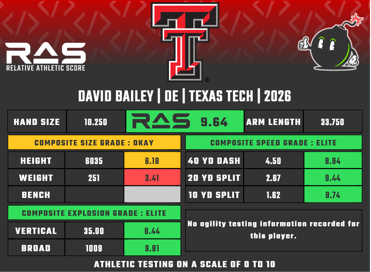 As with TEs, the physical profile of EDGEs has some of the highest correlation with success in the league, so we will have RAS numbers on every available prospect. Here is Bailey's: