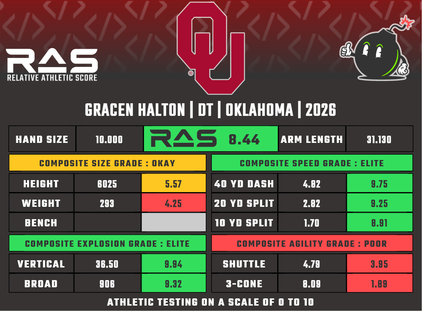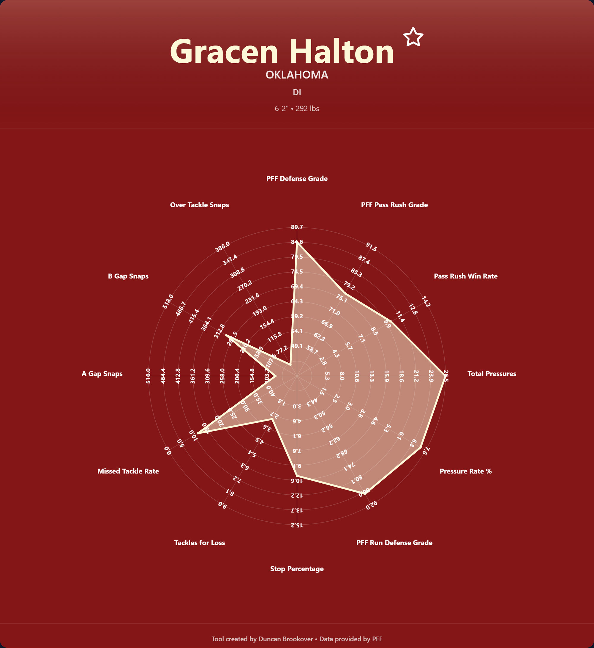 Gracen Halton grew up in San Diego, California, and attended St. Augustine High School, where he was a two-way standout who posted 75 tackles, 20 TFL, and 5.5 sacks on defense while catching 14 passes for 195 yards and five touchdowns on offense as a senior, also playing basketball. A consensus four-star recruit, he originally committed to Oregon in January 2021, but when Mario Cristobal and defensive line coach Joe Salave'a left for Miami after the 2021 season, he decommitted. Gracen signed with the Sooners on National Signing Day, February 2, 2022, saying coach Brett Venables made him feel the relationship was genuine from the start. After two seasons in reserve roles totaling 21 combined tackles, he broke out in 2024 with 30 tackles, 6.0 TFL, and 5.0 sacks. As a 2025 senior captain, he posted 33 tackles, 7.0 TFL, 3.5 sacks, and a fumble recovery returned for a touchdown, earning AP All-SEC Second Team honors. Across 47 career games, he compiled 84 tackles, 17.5 TFL, 8.5 sacks, and three forced fumbles. He majors in human relations and declared for the 2026 NFL Draft.