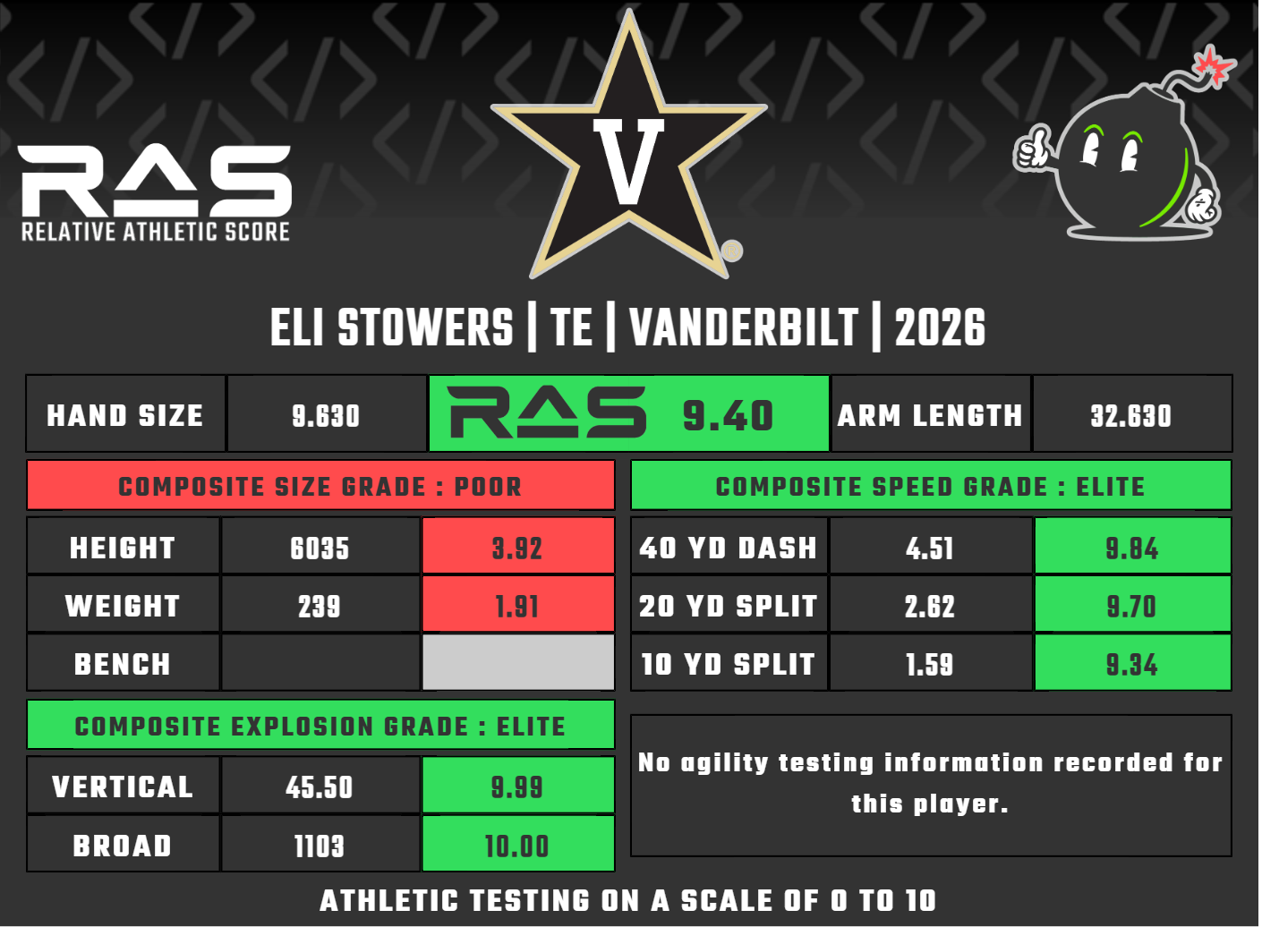 Since TE has one of the highest correlations between physical attributes and success in the league, I figure I shall include the RAS for each player in these write-ups.