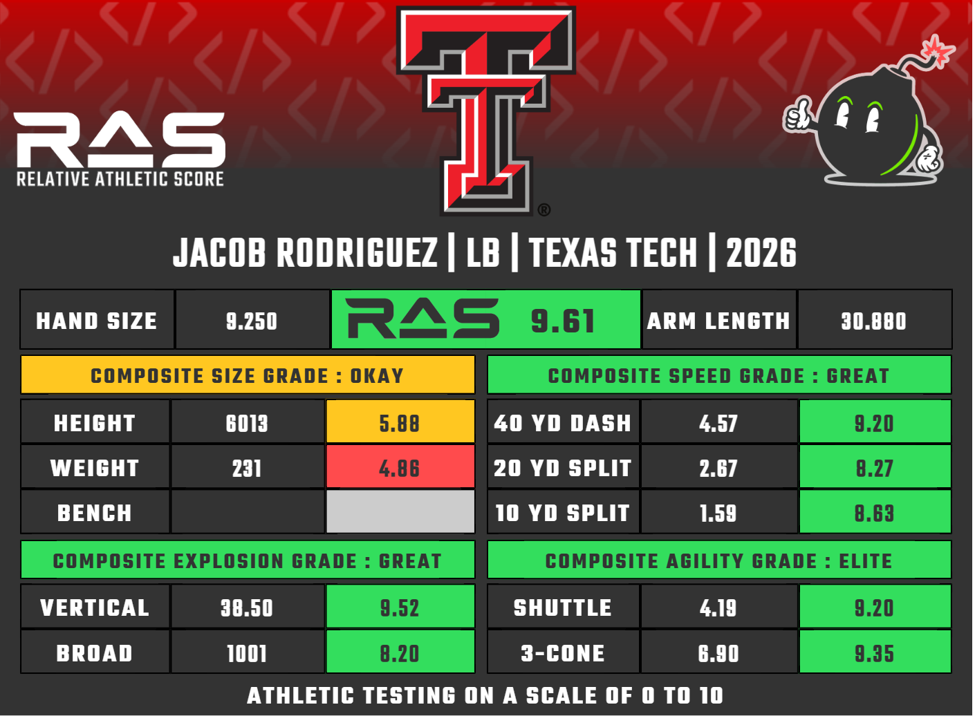 Rodriguez looks like a decent athlete on the field, but I do not think anyone expected him to test like this. He has cleared many fears that he would not have the minimum required athleticism to move into the NFL. This does not show his strength. Linemen do not move him off his spot, and even with his short arms, he does a great job disengaging with them and making plays.