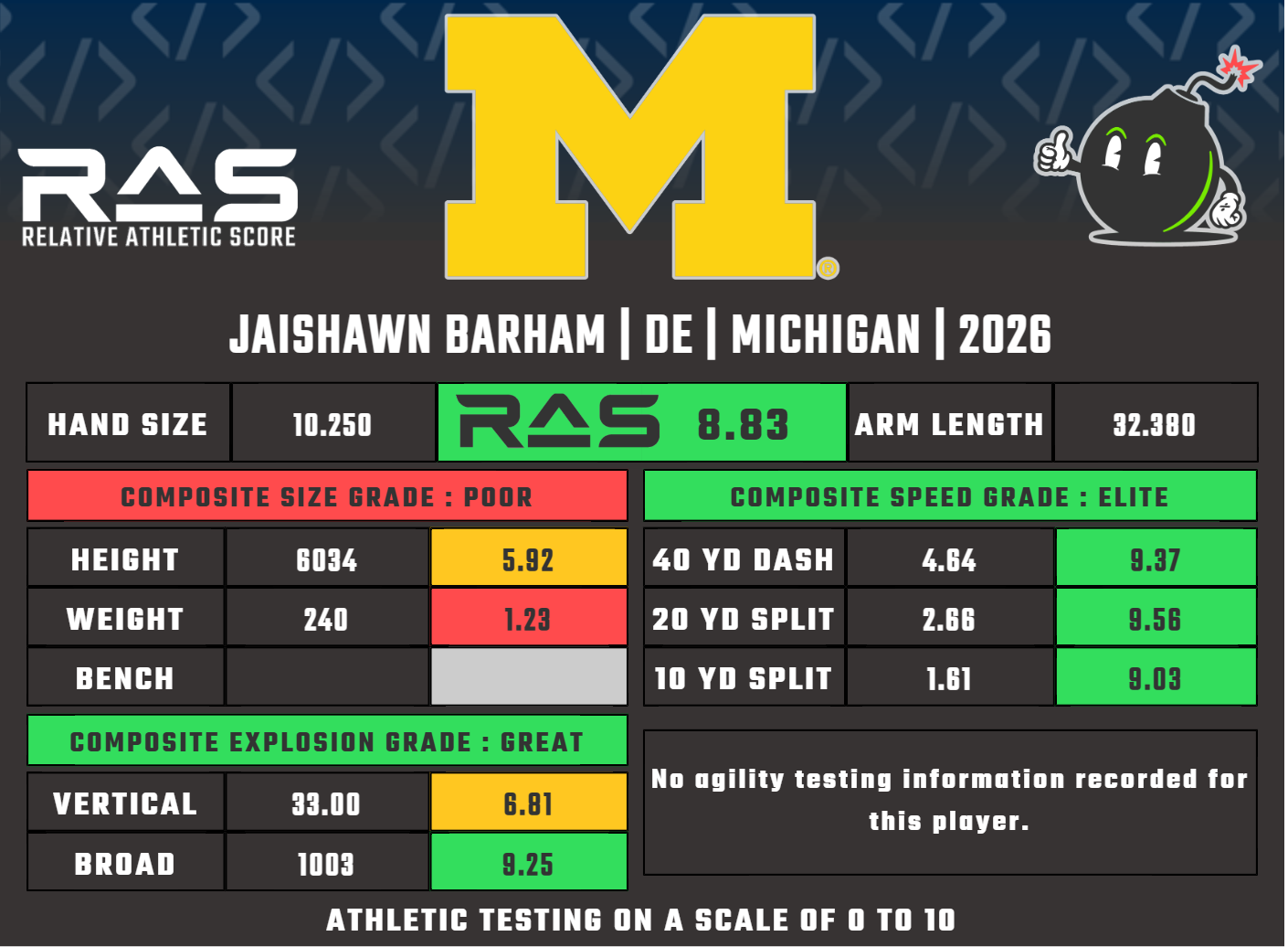 Barham offers an interesting package to a team that wants to try to unlock it. He needs more consistency in his game, but that should come as he continues to learn the EDGE position better. An excellent fit in a three-down lineman system that occasionally asks its EDGEs to drop into coverage.