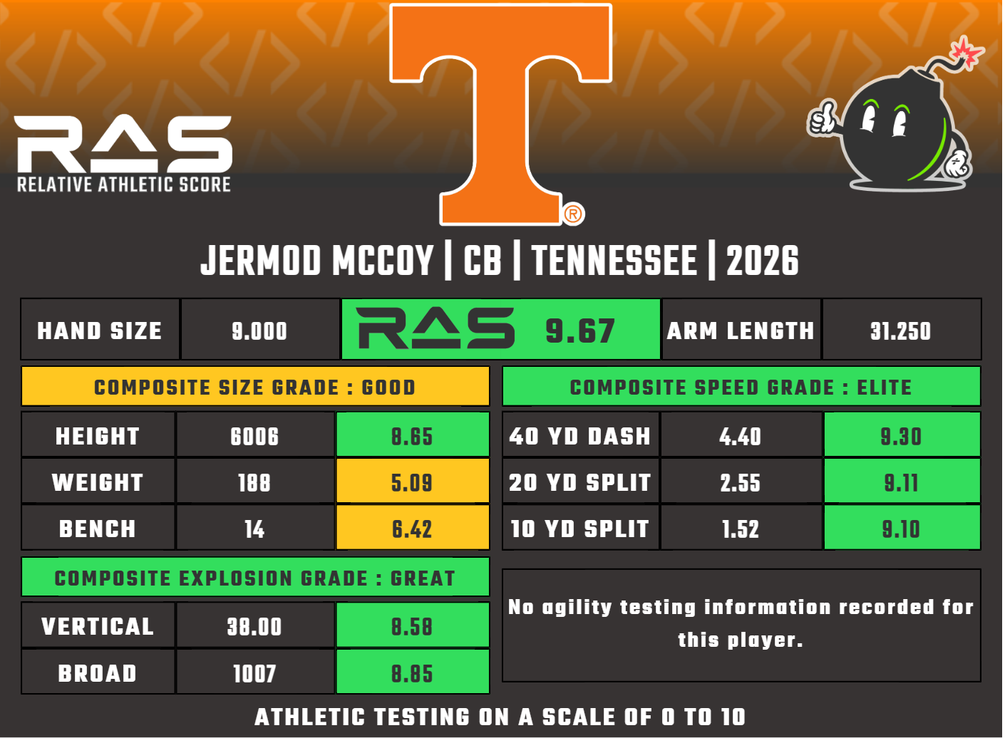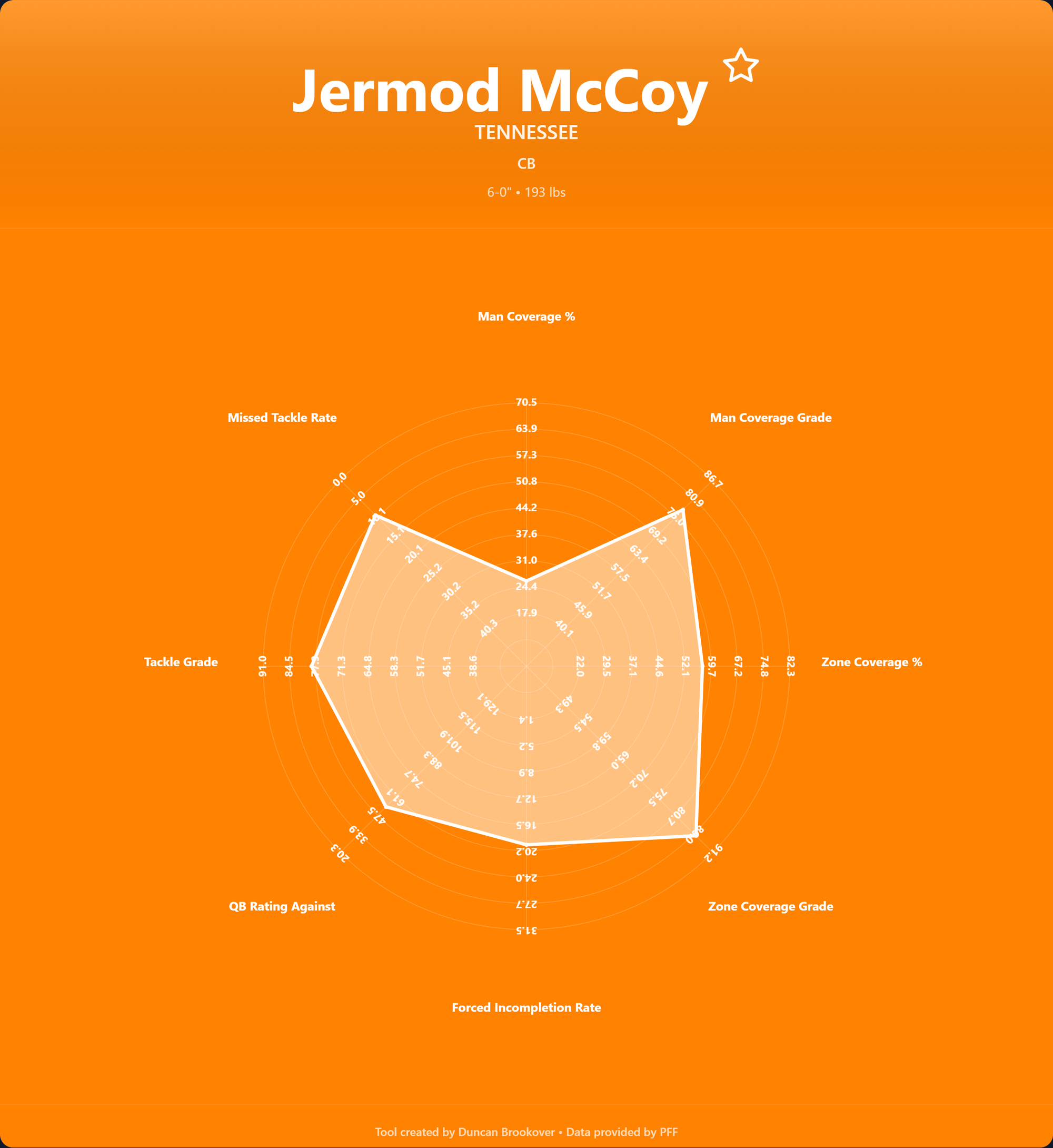Having missed the entire 2025 season, we have to go off McCoy's 2024 season that he played at 19 years old, while helping Tennessee make the College Football Playoff. So knowing that he was 19, and the radar chart already looked like that; its very impressive.