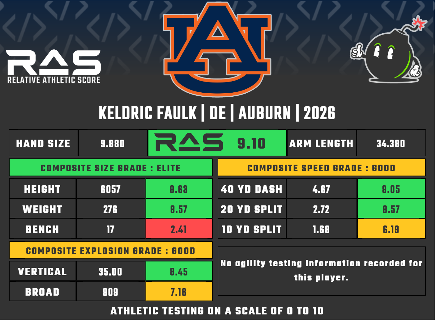 Keldric Faulk grew up in Ramer, Alabama. Tragically his father died in an automobile accident when Keldric was four years old, leaving his mother, Lakendral Barnes, to raise him and his younger brother JJ as a single parent. He attended Highland Home High School, starred in both football and basketball, reached the basketball state semifinals, and earned back-to-back ASWA First-Team All-State honors in football before accepting an invitation to the 2023 All-American Bowl. A consensus four-star recruit with roughly 30 Division I offers, he committed to Florida State in July 2022. Hugh Freeze's hiring prompted him to flip to Auburn on Early Signing Day, and he chose the Tigers partly to remain near his mother. He became an immediate starter, earned All-SEC Freshman honors in 2023, and broke out in 2024 with 11 tackles for loss and seven sacks. He returned for his junior season in 2025, served as game captain for all 12 games, donated a portion of his NIL earnings to help a walk-on teammate stay in school, and declared for the 2026 NFL Draft at only 20 years old.
