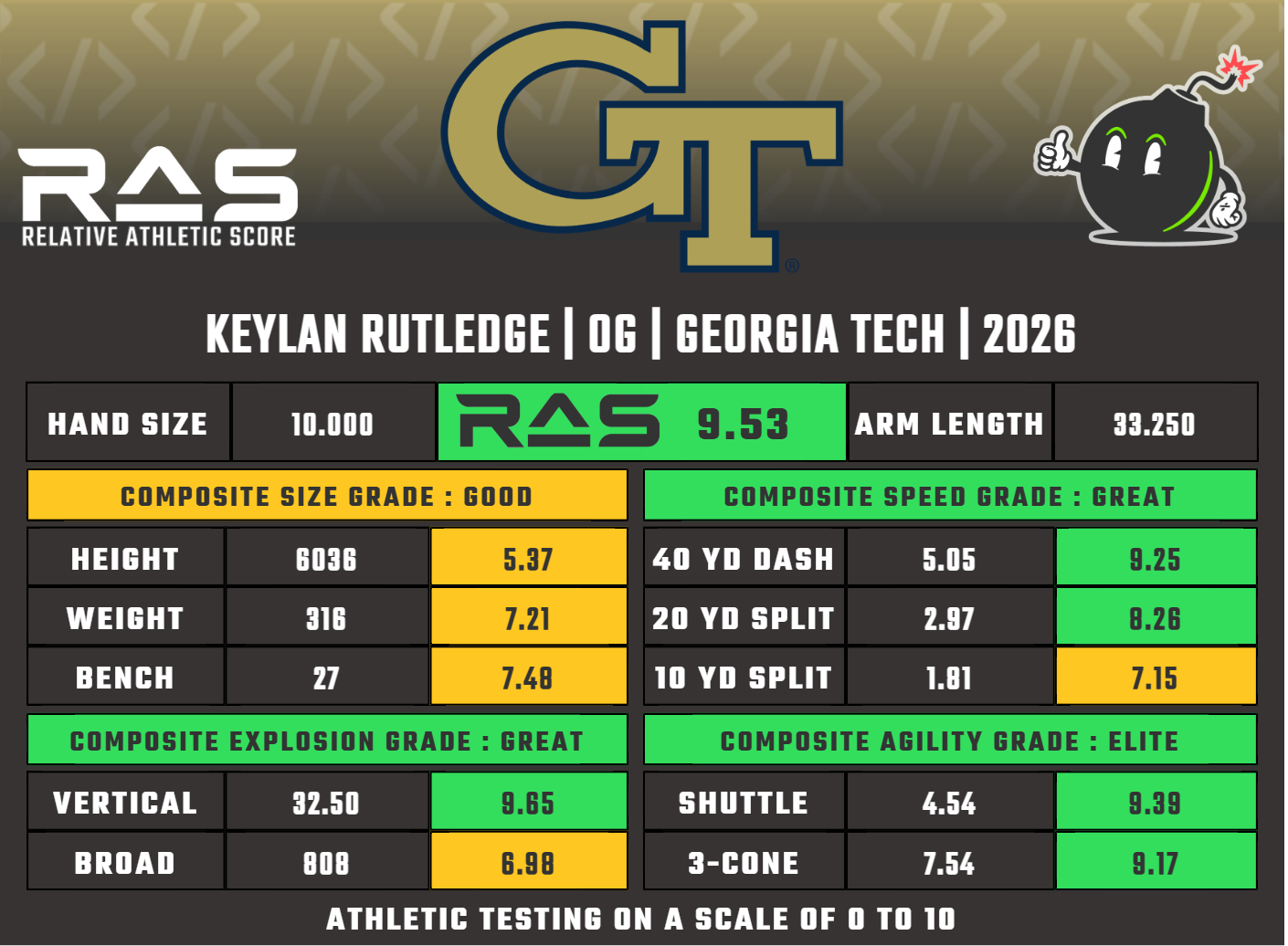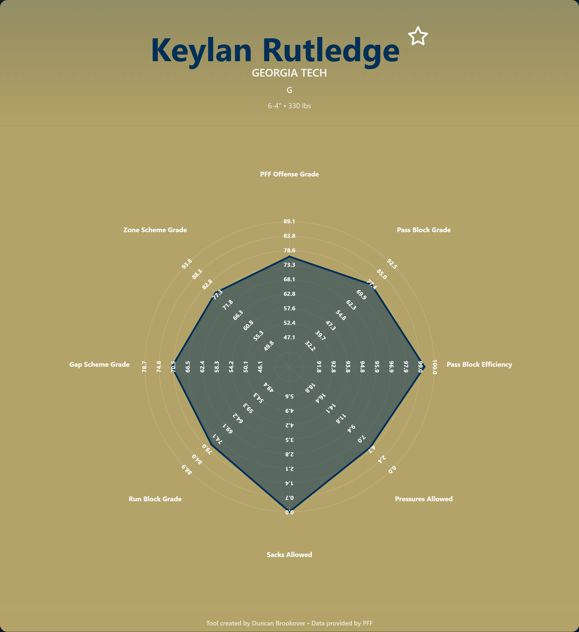 Keylan Rutledge grew up in Cleveland, Tennessee, and attended Bradley Central High School, where he was an all-state basketball player who amassed 1,000 points and 1,000 rebounds and won the state championship in shot put as a senior. No Power 5 programs offered him in football. In 2022, as a three-star recruit, he committed to Middle Tennessee State, where he started six games at right guard and received Conference USA All-Freshman accolades, subsequently earning First-Team All-Conference USA and a team captaincy during his sophomore year. A coaching change at MTSU sent him to the transfer portal, and Georgia Tech won the recruitment. A car accident in December 2023 left him with a severe foot injury that cost him the entire offseason and spring practice. He started all 13 games at right guard in 2024 anyway and earned First-Team All-ACC and All-American honors. He repeated First-Team All-ACC in 2025 while anchoring a line that helped the Yellow Jackets average 31.7 points and 460 yards per game with 197.5 rushing. At the Senior Bowl, coaches had to tell him to tone down his physicality. He declared for the 2026 NFL Draft.