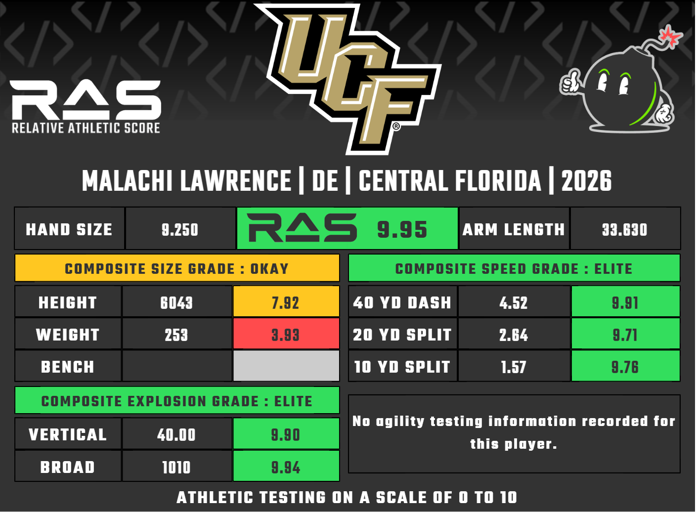 Malachi Lawrence grew up in Louisville, Kentucky, and attended duPont Manual High School, where he played outside linebacker and tight end, was a state shot put medalist as a junior, and held a 3.6 GPA. He committed to UCF as a three-star recruit, in part to be closer to his father who lives in Orlando, over offers from Tennessee and Boston College, then redshirted his first year and appeared in just three games in 2022 while the coaching staff developed him behind veteran players.He started all 13 games in 2023 and recorded 7.5 sacks to earn Honorable Mention All-Big 12, built steadily from there, and earned First-Team All-Big 12 honors in 2025 with seven more sacks. In today's modern portal era, Lawrence is a rarity who spent all five of his college years at UCF. After his five years in Orlando, Lawrence declared for the 2026 NFL draft.