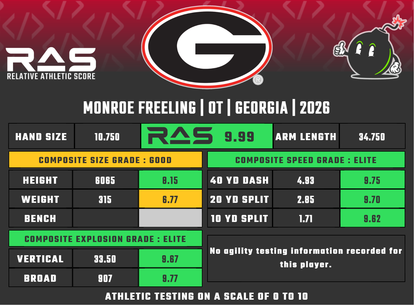 Freeling put up the second-best RAS for an OT ever. The only player ahead of him is Spencer Brown. Those in his neighborhood include Kolton Miller, Taylor Lewan, Trevor Penning, and Jared Veldheer, to name a few. That's some distinguished company. Freeling is not only one of the freakiest testing athletes, but I scored him as an 8.92 during his on field workout at the combine, tied for third best amongst OL. He is such a smooth mover, and while not overly powerful, can make up for it with his size and speed.