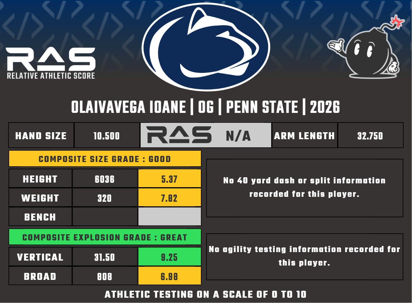 Let that radar chart wash over you. You do not see ones that look as good as that very often. Especially when the team they played for was a dumpster fire during that season. That should not happen, but Vega Ioane was one of the very few bright spots on Penn State's roster in 2025.
