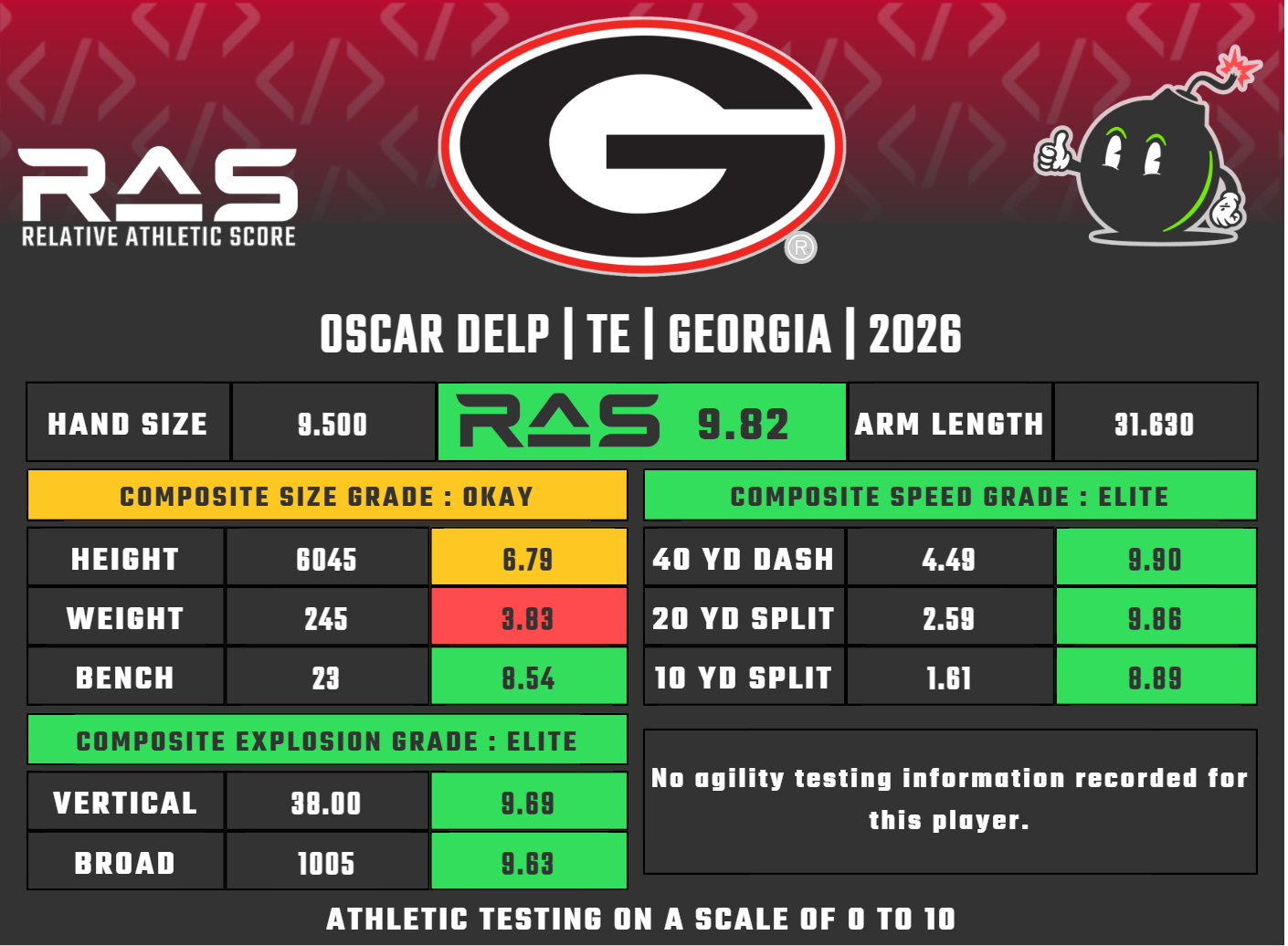 This radar chart tells a story of a specific type of player. That is exactly the player that Oscar Delp is. A hard-nosed blocker with some intriguing pass catching ability because of his size, but ultimately one who does not know what he is doing out there.