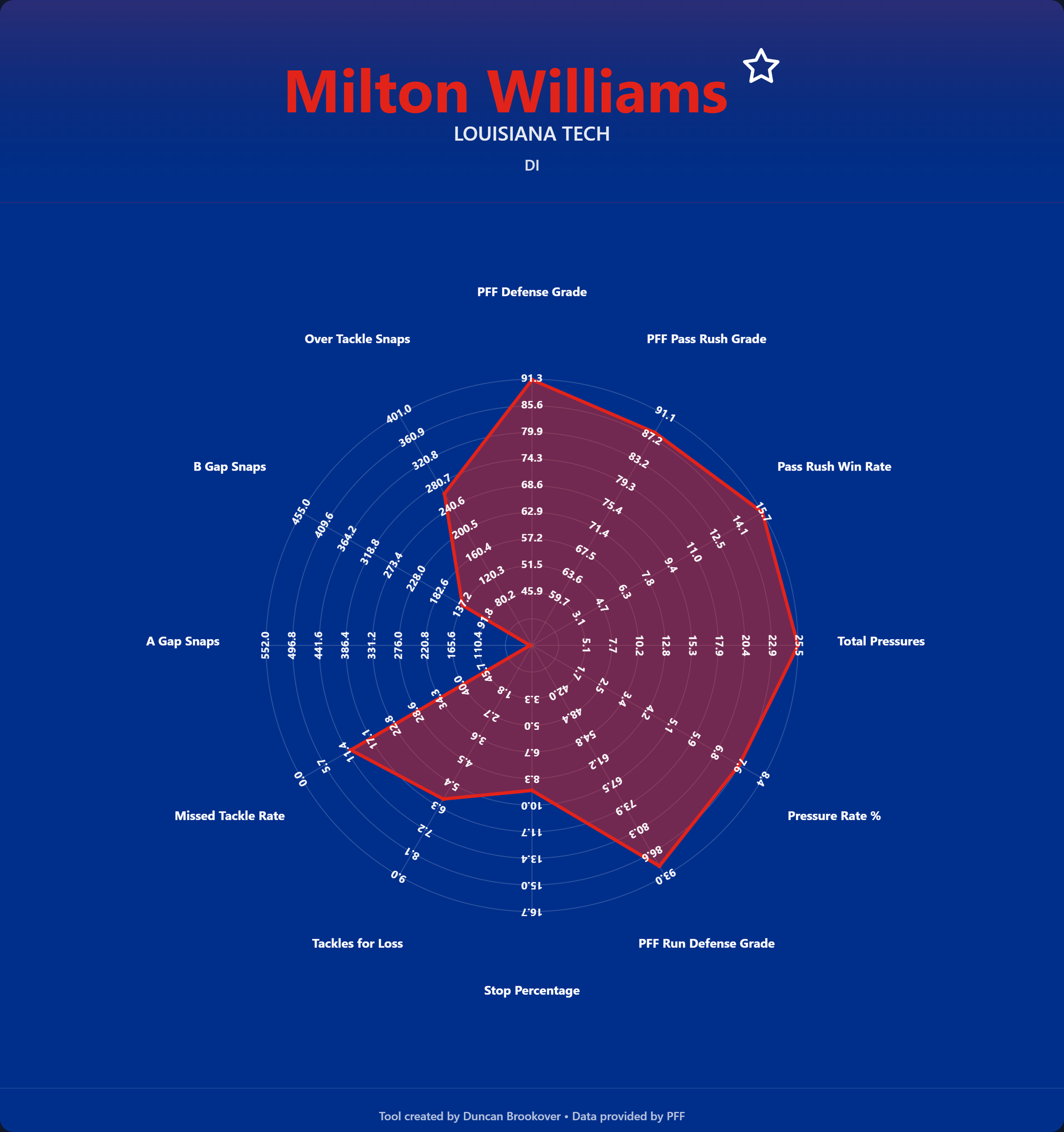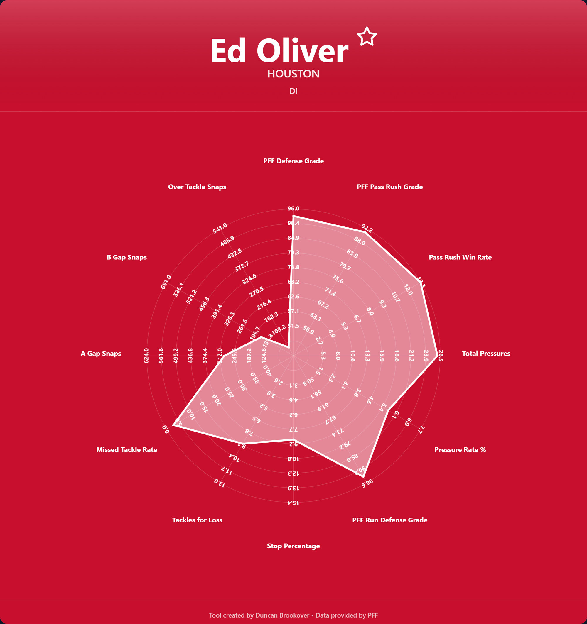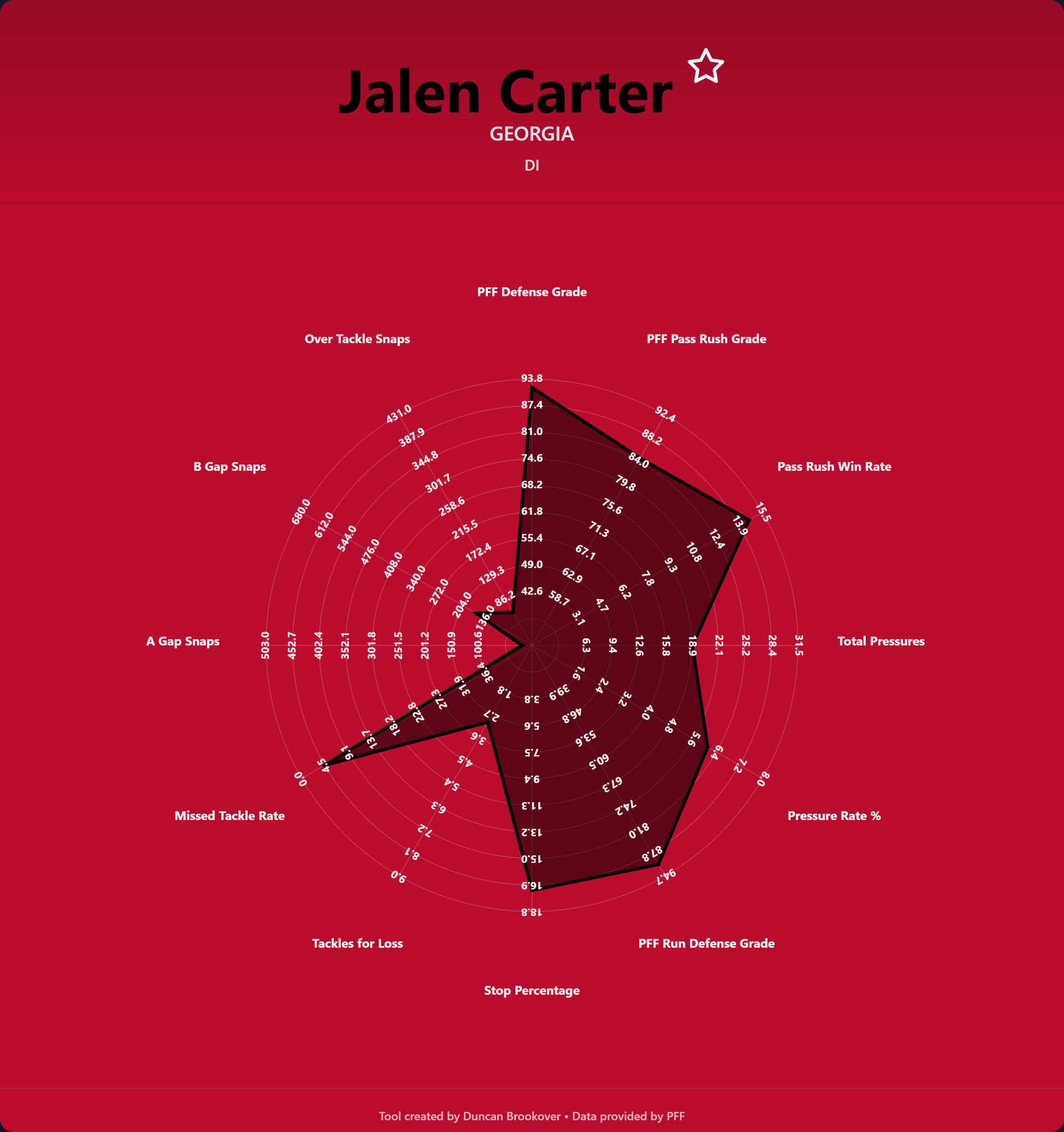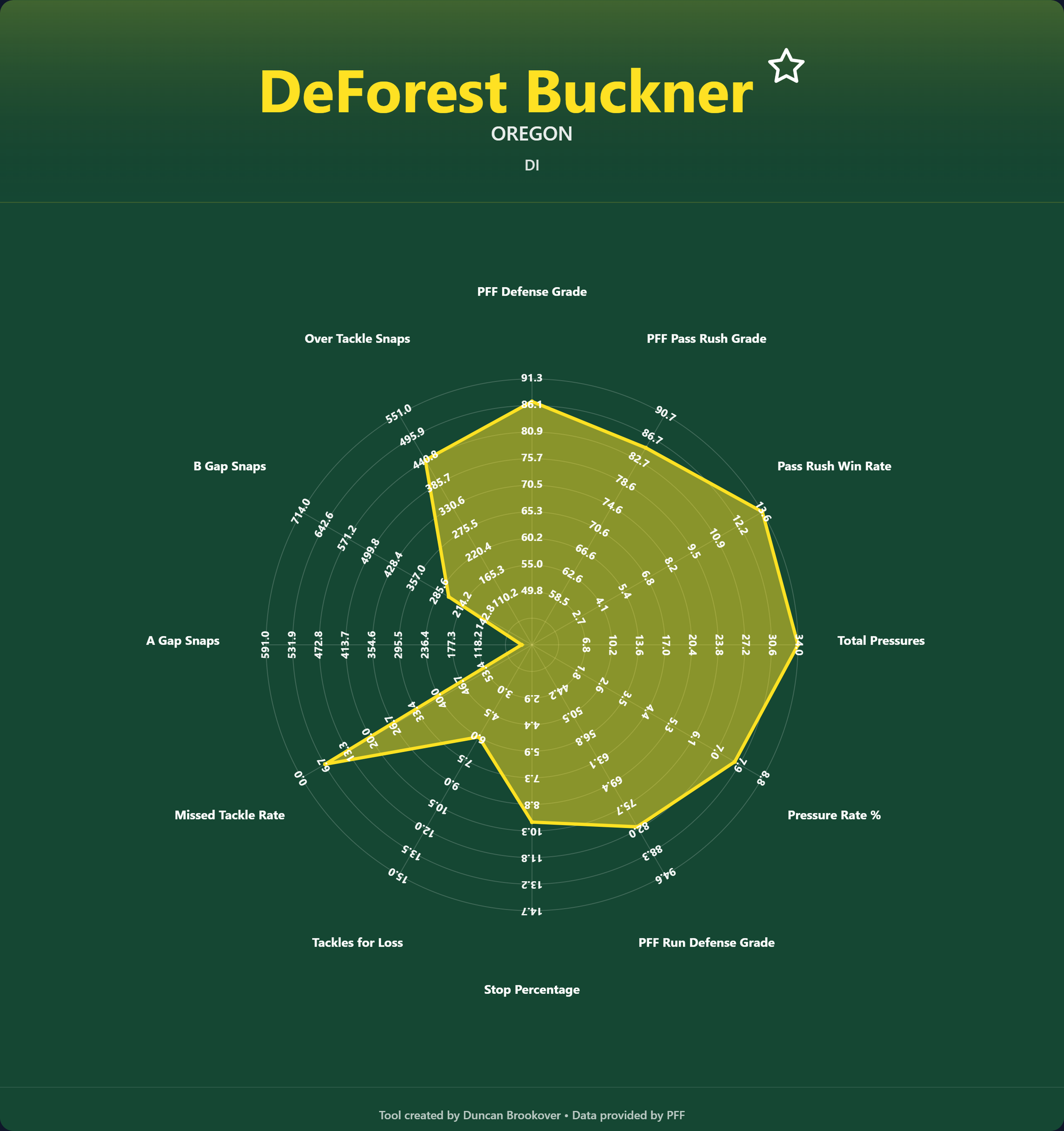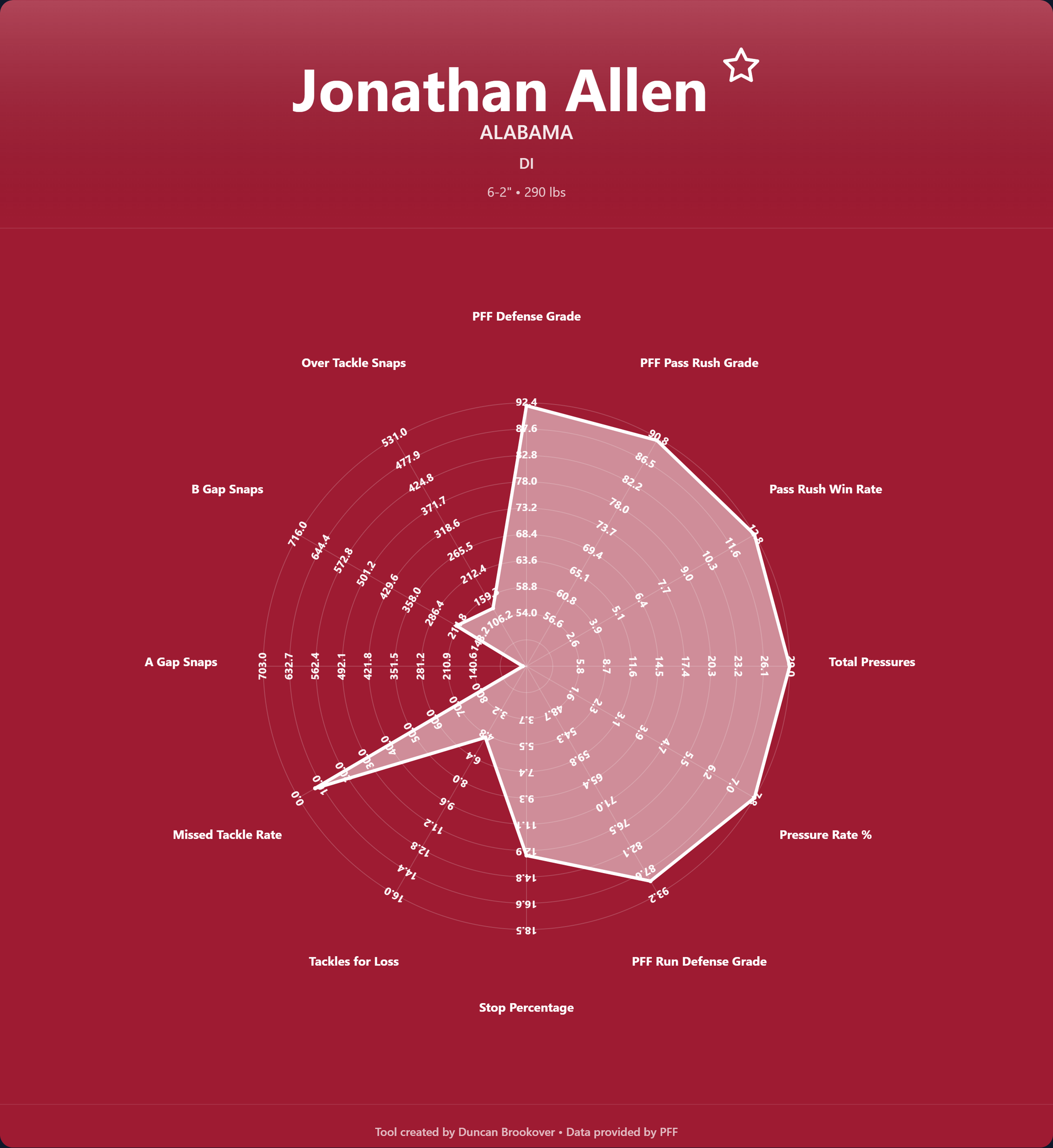 Radar charts give a quick and easy look at the kind of player you are looking for. The statistics represent different DT archetypes. Do you have a pure pass rusher, a big nose tackle, or an all-rounder?