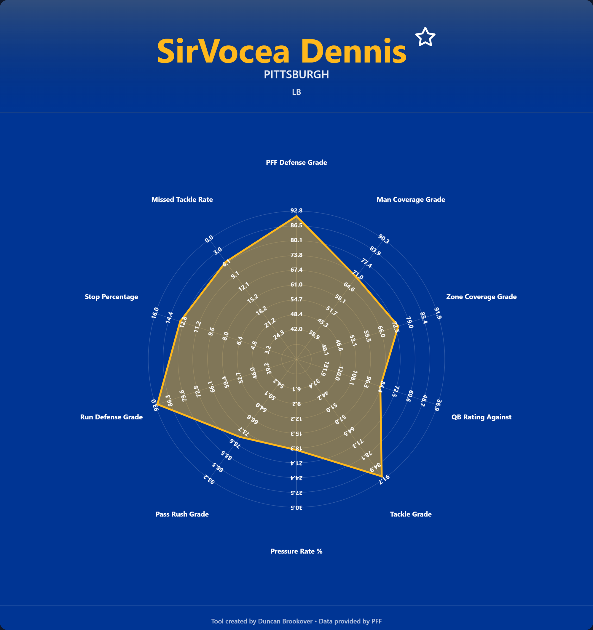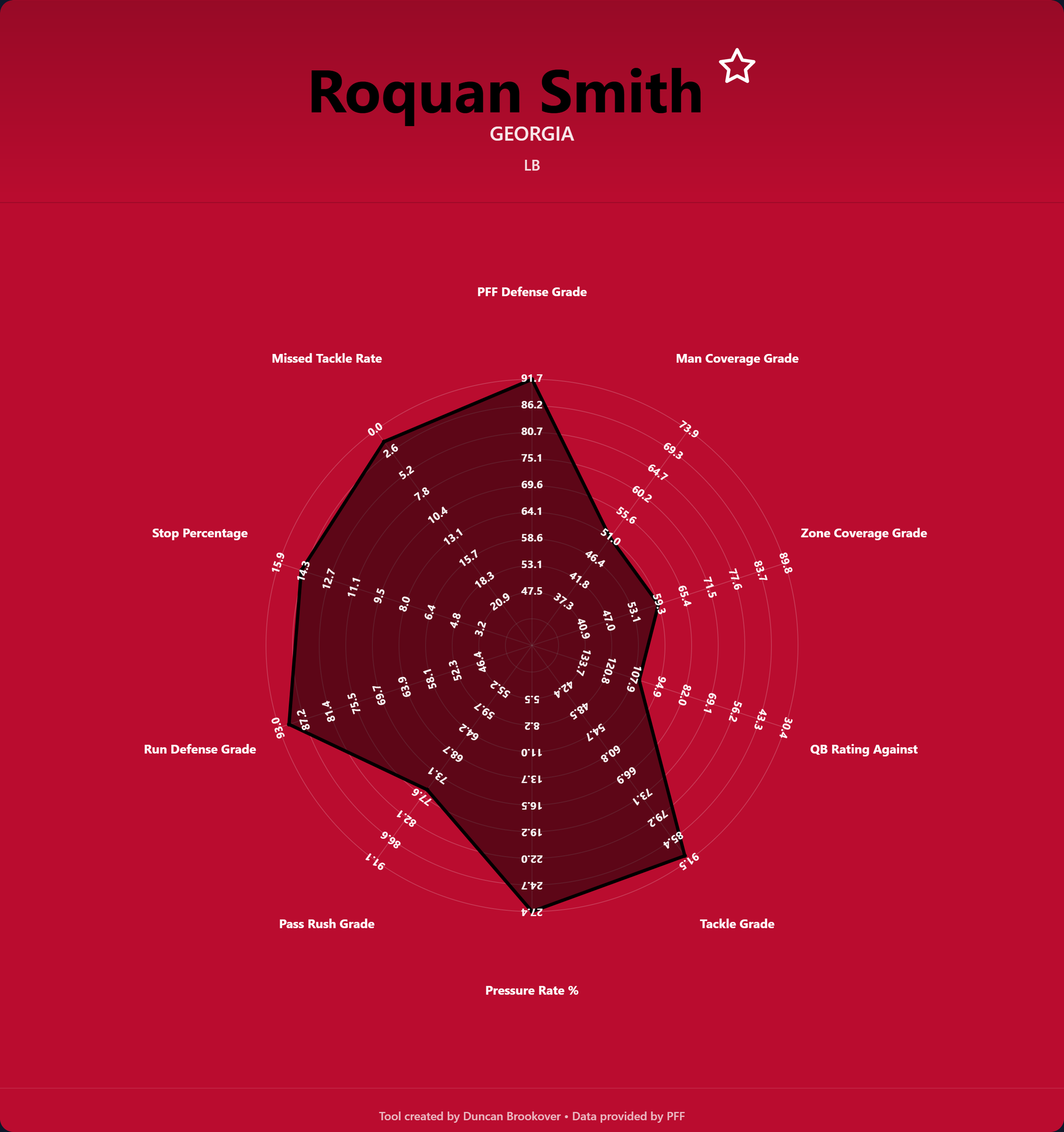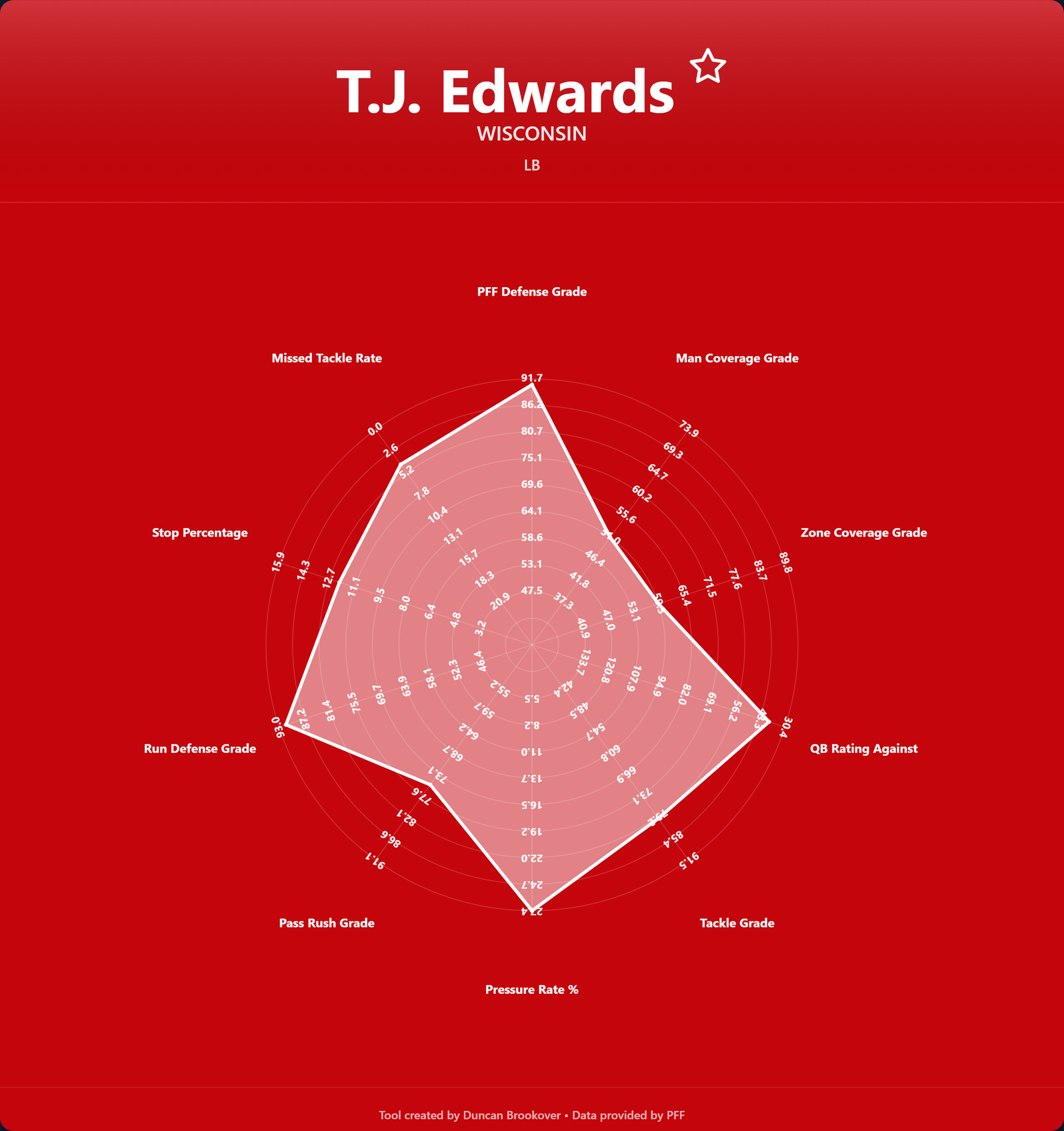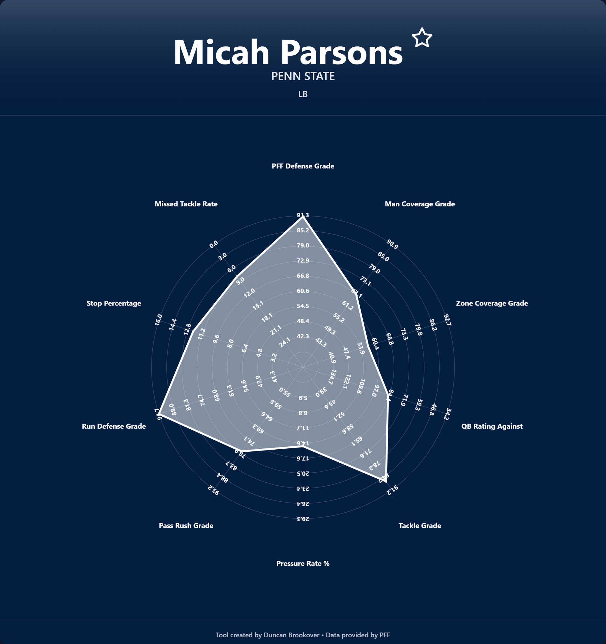 - PFF Defense Grade – A proprietary PFF rating capturing a linebacker's overall contribution.