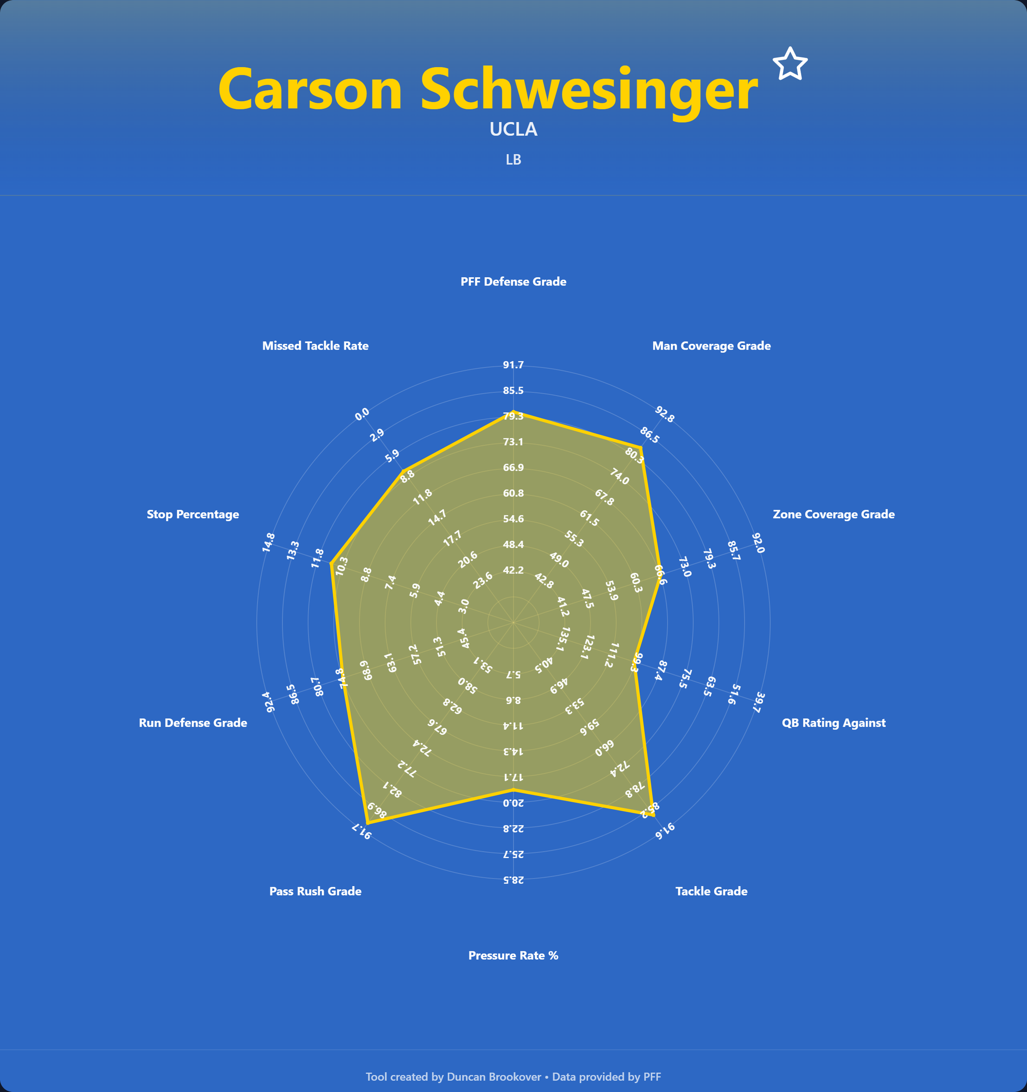 Radar charts give a quick and easy look at the kind of player you are looking for. The statistics represent different LB archetypes. Do you have a run stuffer, a pass rusher, a coverage player, or an all-rounder?