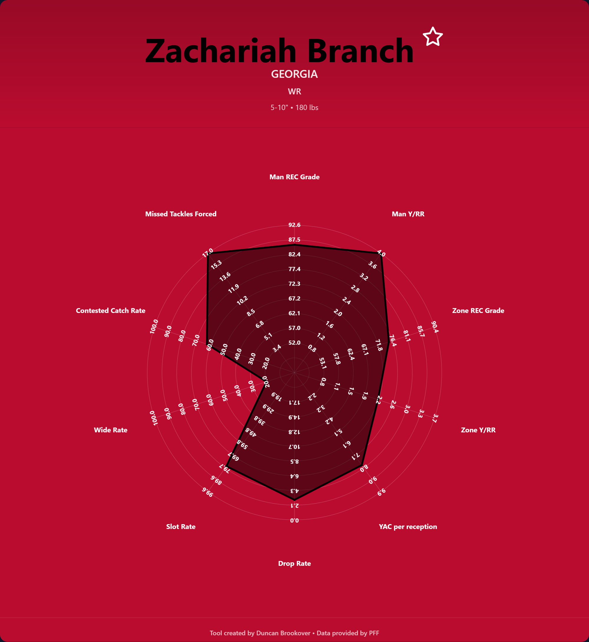 Zachariah Branch is an undersized receiver, standing only 5'8" and weighing 177 lbs. He is an explosive athlete, though. He ran a 4.35 40-yard dash at the combine, combined with a 38-inch vert and 10'05" broad jump. On the tape, all of that shows up too. He looks like a waterbug out there, constantly flitting from one area to the next and flying by defenders in the process. His agility is top-notch, and his first step is faster than most players' top speed. He does have the downsides of his frame, like a smaller catch radius and so on, but just because he is more slight, it does not denigrate from his toughness with the ball in his hands. He will take a hit and bounce off of it, the rare times a defender can get a hard hit in, that is.