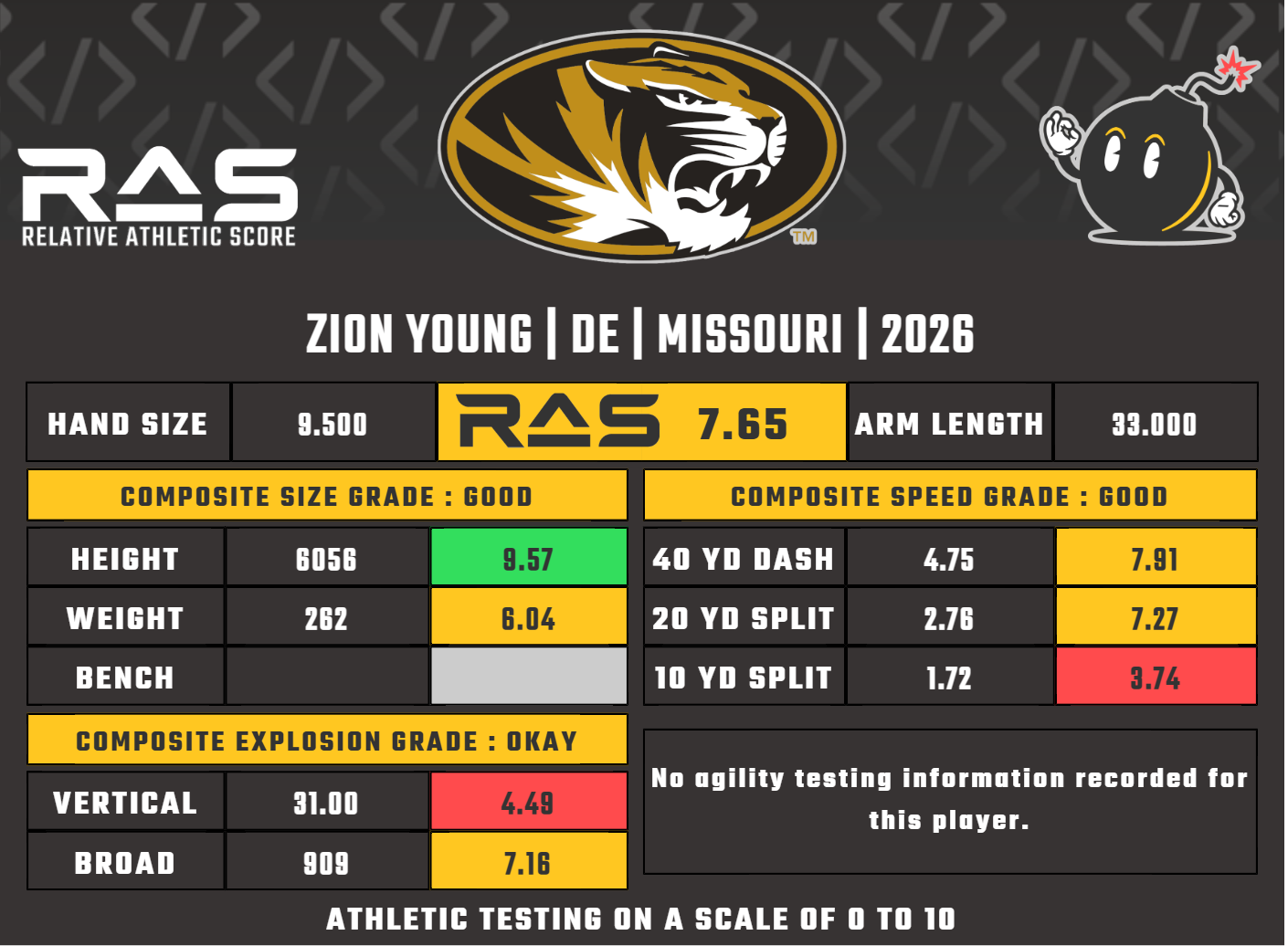 Young is more of a big, lumbering EDGE than he is a quick or fast one. You take that for someone who is nearly 6'6" and 262 lbs. He has great strength in his upper body and has a strong ability to anchor against run blocking as well. Young is not agile and struggles to change direction quickly. Overall, not an impressive athlete, but one who clears most basic physical thresholds.